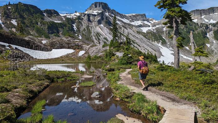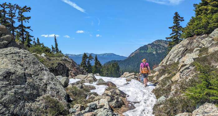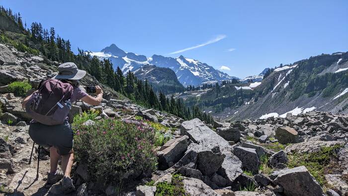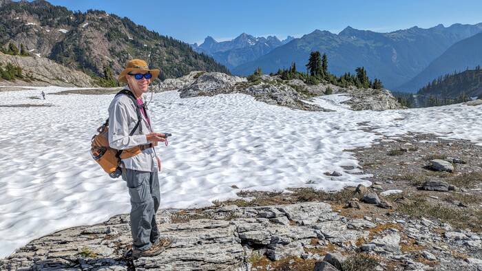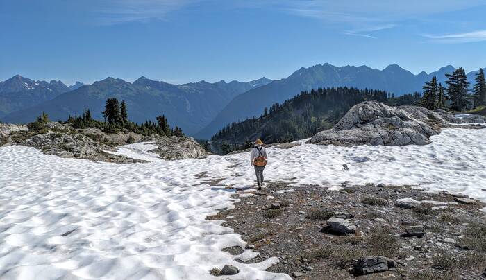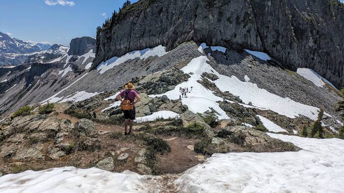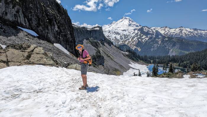 At Herman Saddle, there were lots of people milling about, playing in the snow, doing yoga, and just taking in the expansive views of both Mt. Baker and Mt. Shuksan