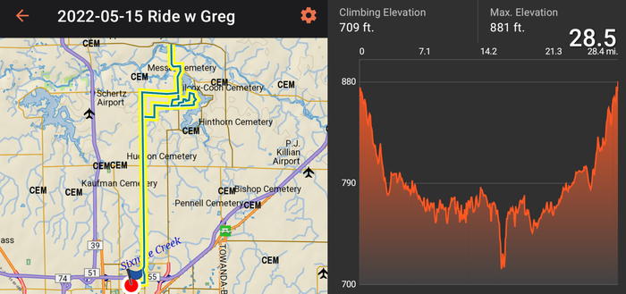 28.5 mile loop/out and back - through some corn fields as well as a wooded section with a big lake as well as some creeks.