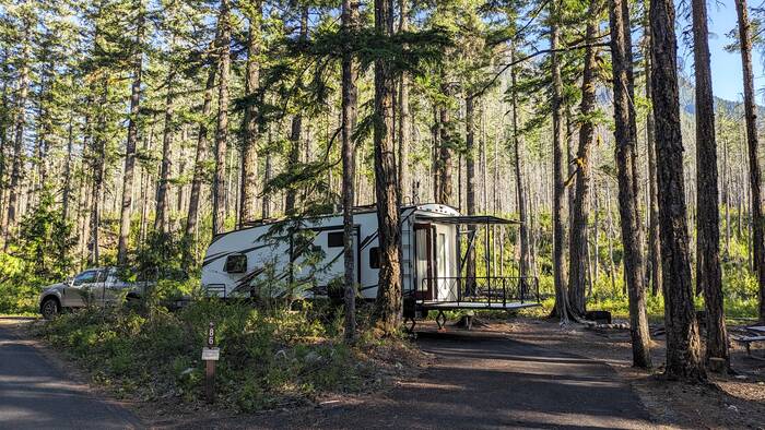 Despite the fact that the campsite was a "pull-through", we could not actually drive straight in because of the tight curve of the driveway and the tree placement. Luckily, backing in was relatively easy. Because there had been a fire here in 2015, the tree cover was not so dense, so we were hopeful to get more solar here than in our previous couple of campgrounds.