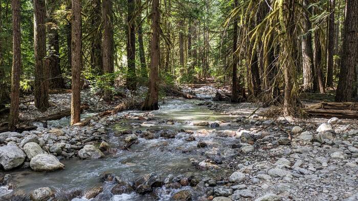 At the confluence of Newhalem Creek with the Skagit River