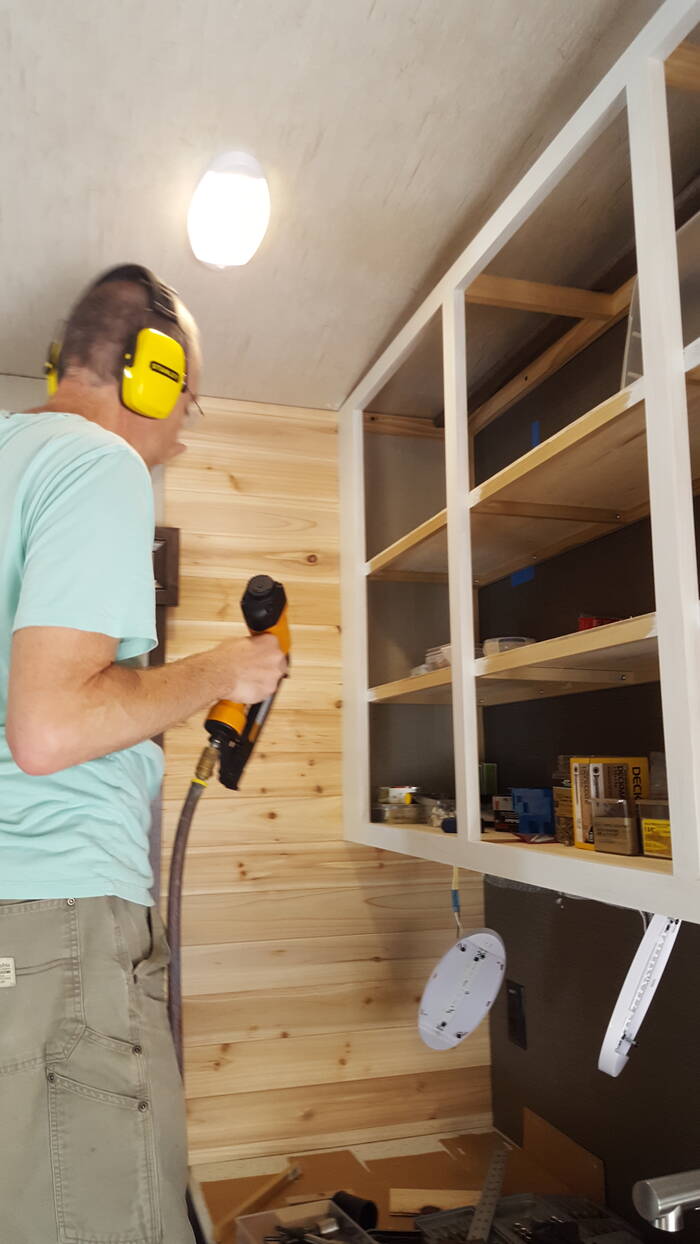 Cabinets are finally getting covered with doors, both the sliding doors and doors with hinges. The cabinet doors are made from 1x3 pine with 1/4 inch grooves cut into them to hold 1/4 inch plywood and everything is held together with pocket screws (my new favorite fasteners).
