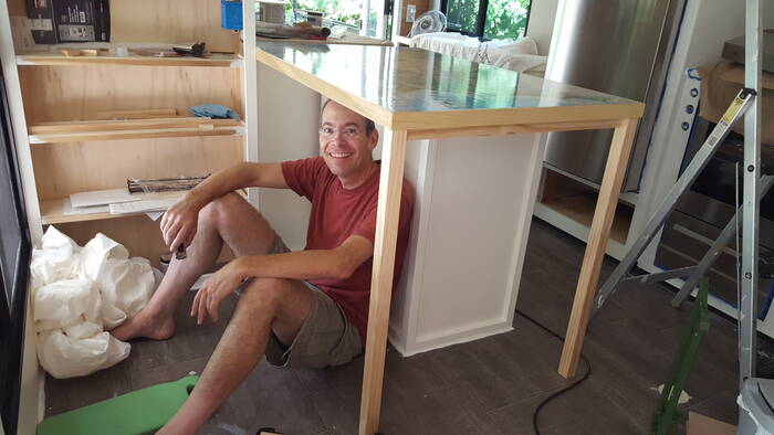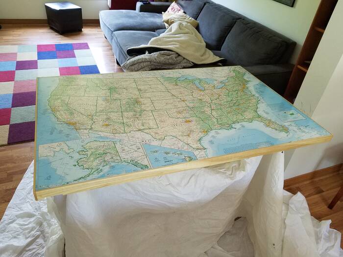 The peninsula for the kitchen is made up of plywood and wood trim with a big US map inset into it with layers and layers of polyurethane covering it all . . . we found out it is really hard to fill in cracks around the map and get everything smooth . . . more sanding . . more layers . . .