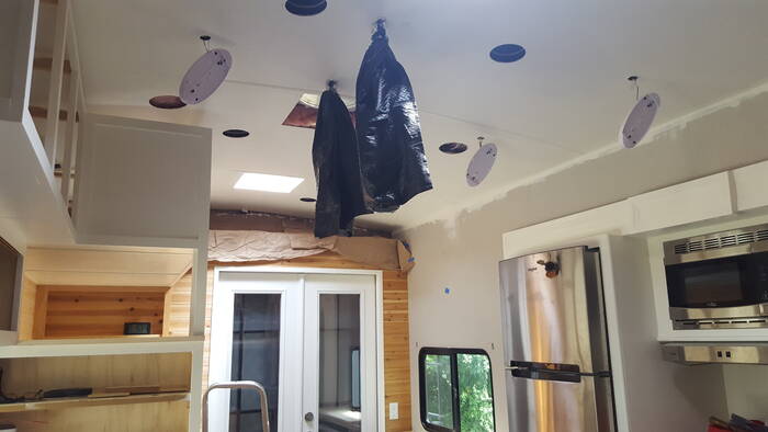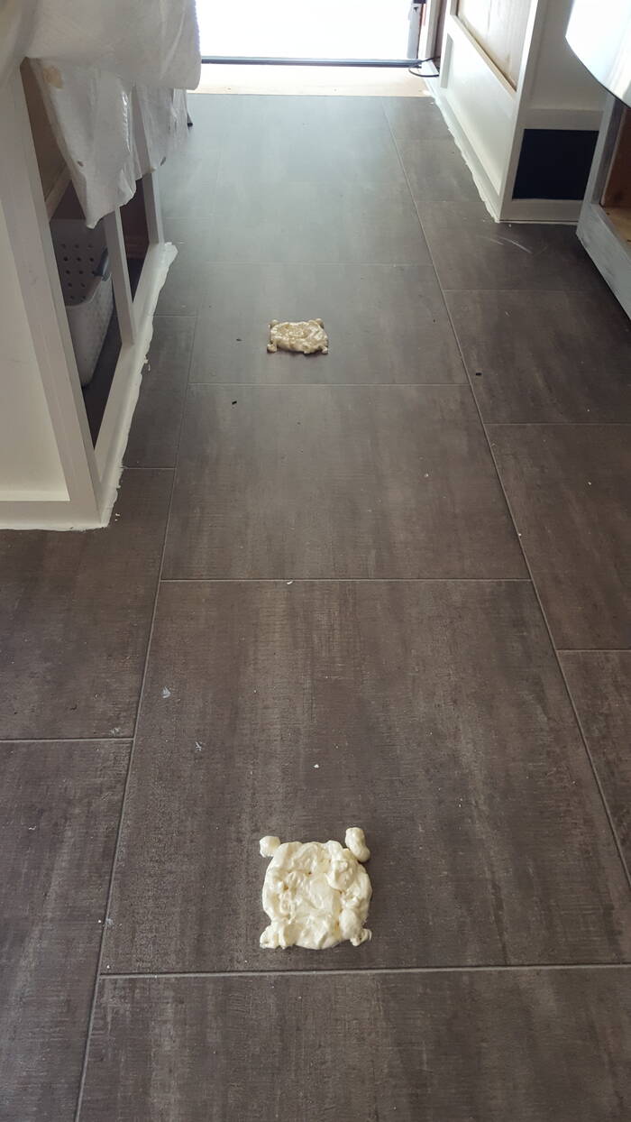 Speaking of the floor - there were holes where the tie down anchors were for (to hold down vehicles - this was after all a toy hauler). The holes got filled in with random wood and Great Stuff expanding foam . . boy is that stuff sticky!