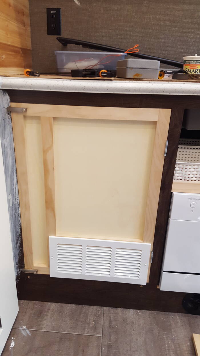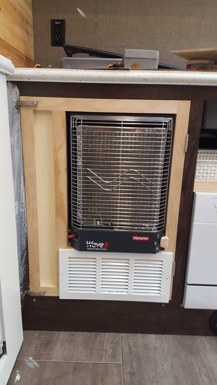 A catalytic heater was installed under the kitchen cabinets and made to hide away when not in use . .