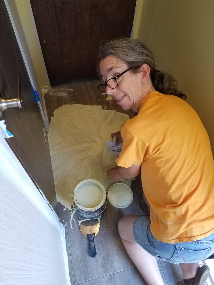 And finally we leave off with a picture of the floor after a gallon of paint dumped over . . . and that is why we are replacing the floor last ;-)
