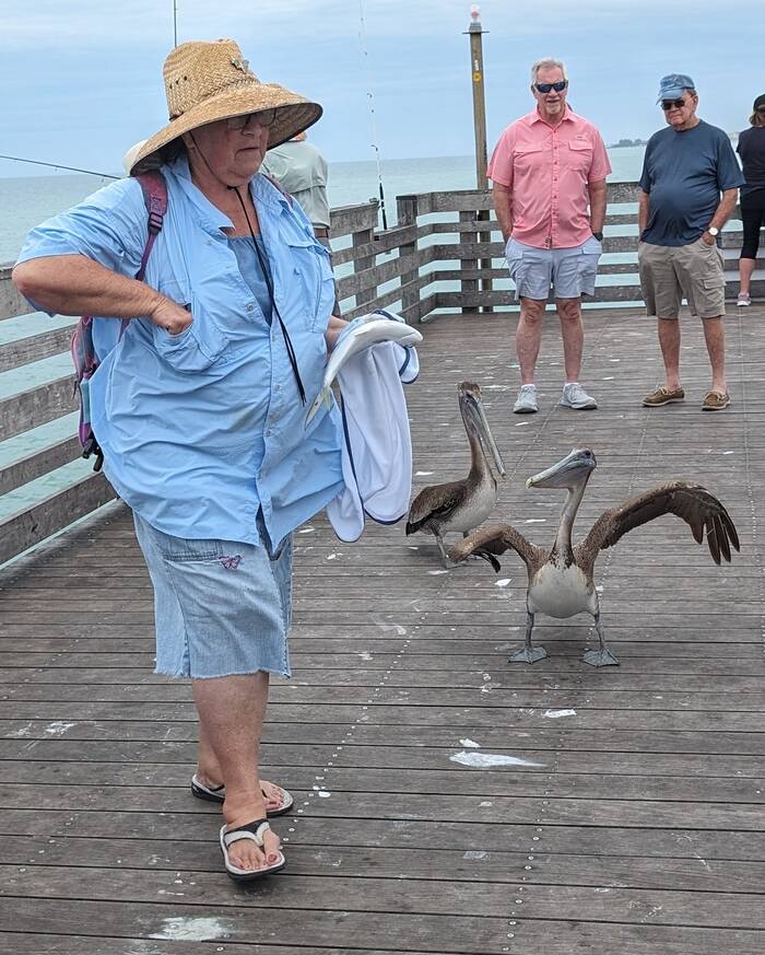 This lady ended up warding off the pelicans with her purse shortly after this picture was taken