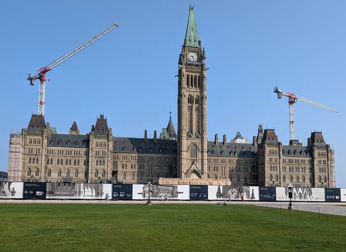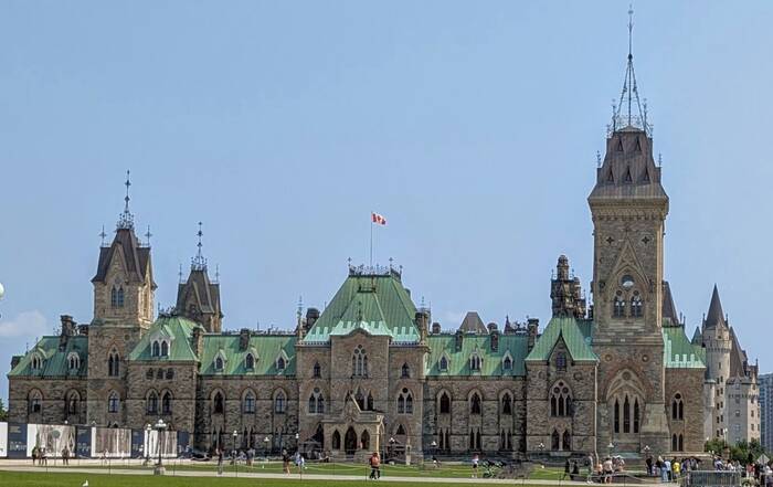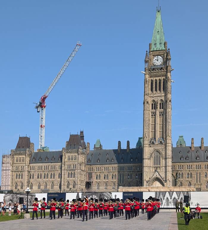 The next day, we drove back into Ottawa for a tour of the House of Commons. (We had also previously booked a tour of the Senate as well, but it had been cancelled due to "parliamentary activity".) Both branches of government are normally housed in the Center Block of Parliament, but that building is undergoing a multi-year, multi-billion-dollar renovation project which isn't expected to be completed until at least 2030. So, the House of Commons has a temporary home set up in the West Block building in a converted courtyard, and that's what we got to see. We arrived a little early to witness the "Changing of the Guard" ceremony and listen to the band concert.