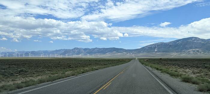 Approaching the next mountain range and wind farm