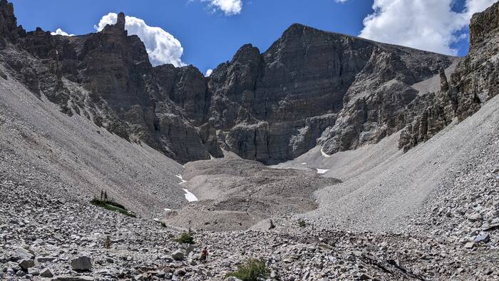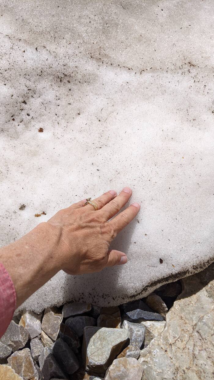 The glacier is hidden under the gravel, so it's not super impressive. There's only a little snow left from last winter.