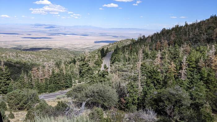 Wednesday was looking to be the nicest weather day, so we took off for Great Basin National Park, one of the least visited national parks in the United States. It is famous for a few things: Lehman Caves (we've seen caves before, so we skipped the tour this time around), bristlecone pine trees (the oldest living things in the world), and Nevada's only glacier (although we saw a sign pointing out a glacier when we were in the Ruby Mountains, so not sure this absolutely true). The drive into the park was a twisty road leading from the dry, dusty valley up to the forested mountain top, complete with many switchbacks and grand views.