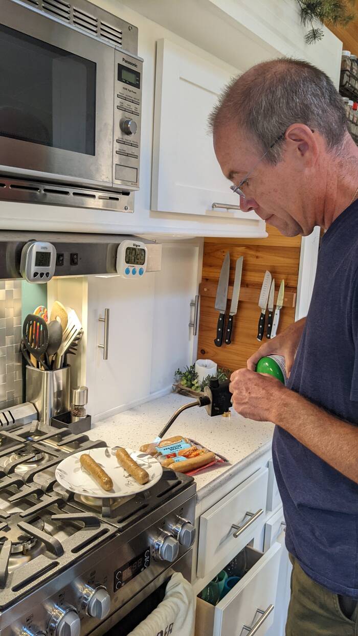 One of the evenings we had planned to have brats on the grill, corn on the cob, and watermelon, but the sky decided to storm on us. So, we improvised a little.