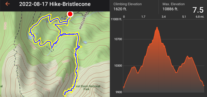 We hiked a trail which passed by some lakes and an old bristlecone pine tree grove and ended at a glacier. The hike was 7.5 miles roundtrip.
