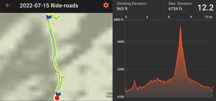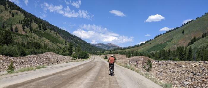 Our second ride was 21 miles (out and back) along the Custer Motorway. In the 1800s, this road was a toll road used for stagecoach passengers and for getting heavy equipment to the mining towns of Custer and Bonanza. This was a really nice gravel road that followed the Yankee Fork through the mountains. This rated as one of our best rides yet.
