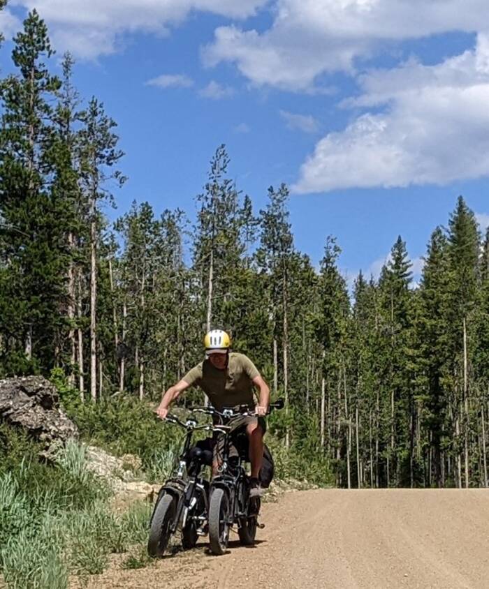 Julie's personal bike retrieval service. Or, Rick acting out his hidden desire to ride a 4-wheeler. Or, insert caption of your choice.