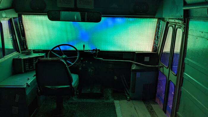 This bus was tipped sideways so that the front of the bus was up against the ceiling. You could "sit" at the back with your back basically against the floor looking up. There were controls that you could operate to change the colored lights. Yeah, kind of weird, but oddly fun.
