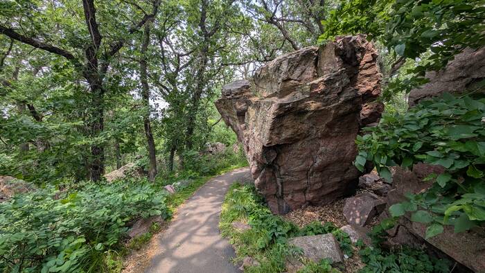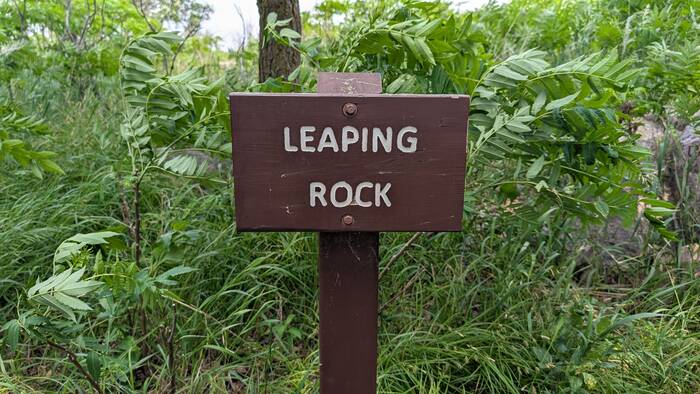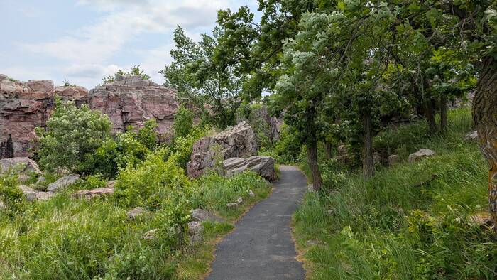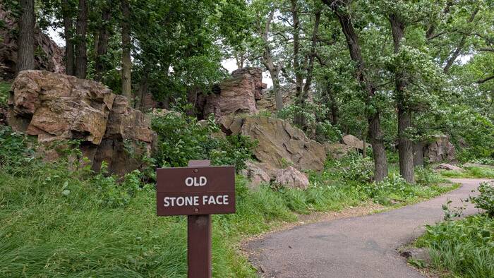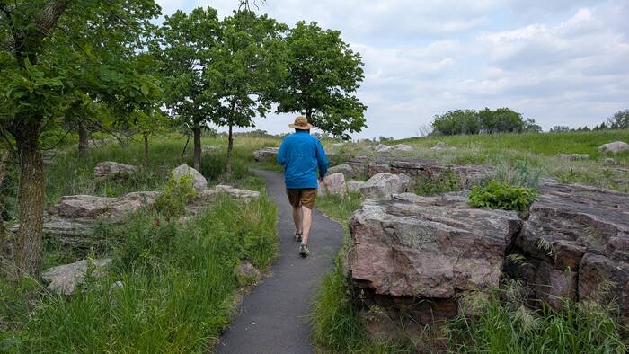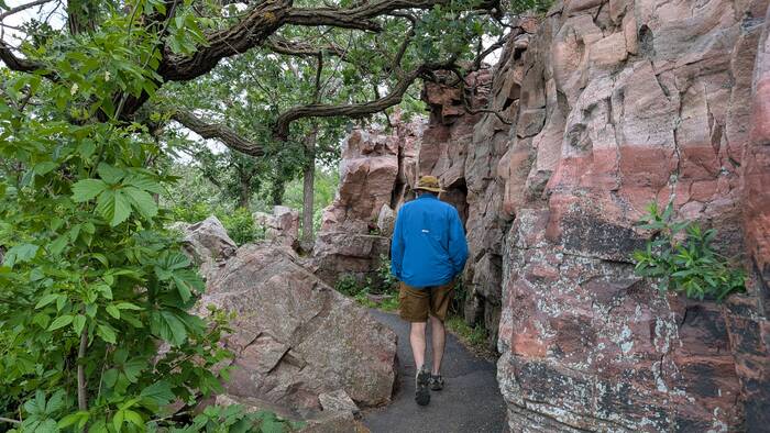 The next day's activity was Pipestone National Monument in southwestern Minnesota, about a 45 minute drive from Sioux Falls. The monument preserves an interesting geological area containing a historic catlinite (aka pipestone) quarry that Native Americans used for raw material for their ceremonial pipes. As national monuments go, it is pretty small--a visitor center and a 3/4 mile trail rounds out the public access portion of the park. Additional acreage is set aside for registered present-day tribe members to mine pipestone via permit. Only hand tools are permitted, and it is difficult and tedious work to dig through the deep layer of hard quartzite before reaching the relatively thin layer of pipestone.