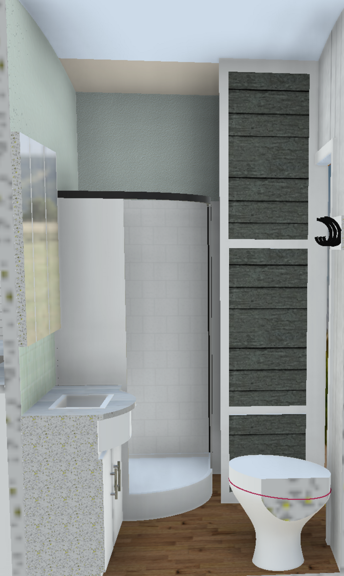 The bathroom remains largely the same. The plan is to replace the toilet with a nicer model, but the rest is decorating. On the left is the sink with new cabinets above it. The corner shower stays the same, and the storage to the right (with the water heater in the bottom) gets a new look but remains in the same place.