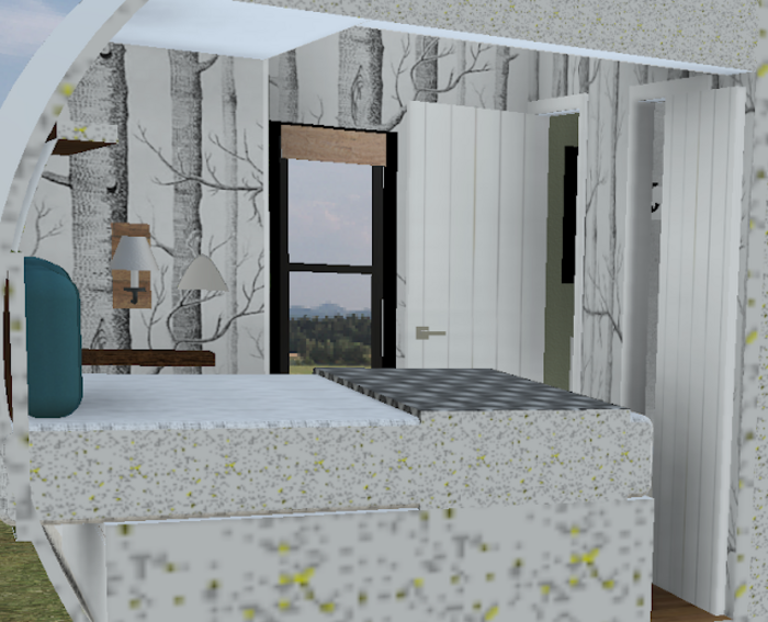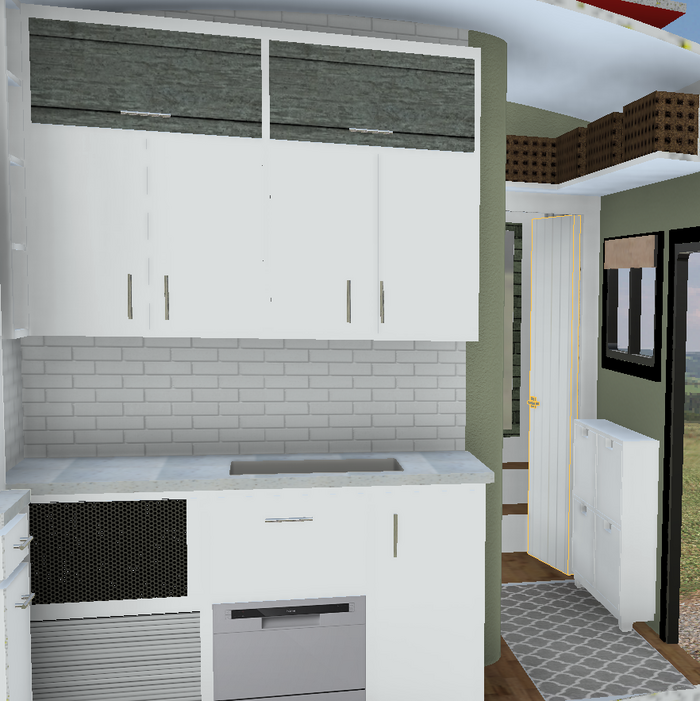 Another fake view . . . this one is with the wall of the camper missing and looking back towards the hallway and bathroom. The hall is the door next to with window and the other sliding door leads to the bathroom.