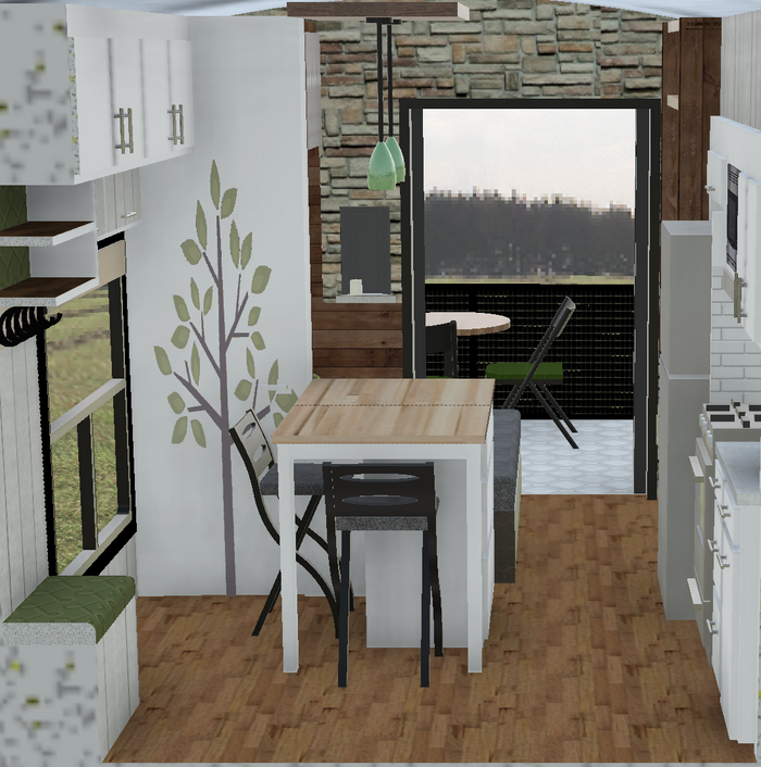 On the back wall is the refrigerator and stove in the slide (same place as original stove and fridge). We are switching to a residential refrigerator and an apartment size stove (so we get real burners and an adult oven). Another addition is a window over the counter so we get extra light - adding a window will be interesting . . .