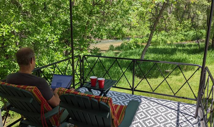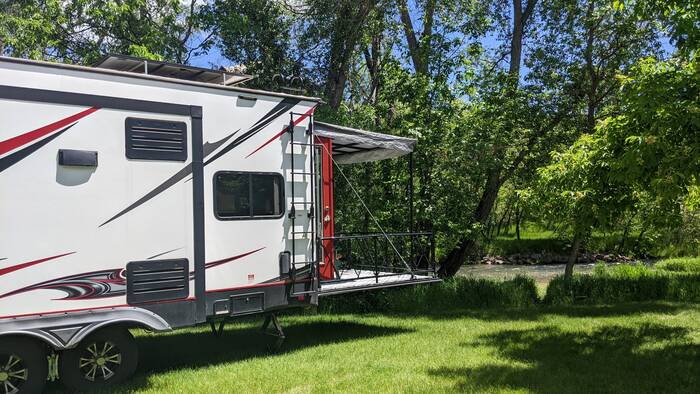 Our arrival at Spearfish City Campground was uneventful except for deciding where to park. We had reserved a less expensive dry camping site (no hookups), but there were no assigned sites. Basically, you could park on any lawn that wasn't a designated numbered site. After a couple of loops around the campground, we found a spot along the river that we could squeeze into without too much trouble. Rick wasn't too keen on parking on the soft-ish grass, and the camper wheels kind of sank in a bit, but it seemed ok. (We'll see how it goes pulling out next week!) It was a nice bonus to have Spearfish Creek in our backyard, though!