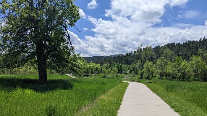 Spearfish was hosting a bike race on Saturday which had various routes through mountains on gravel roads (their lowest category even allowed e-bikes). We were originally planning on riding on some of the gravel roads in the area, but with the race going on, we were not quite sure what roads they would be on. So, we opted instead to do a leisurely roll around town on our bikes. Spearfish has a really nice set of connected parks and bike trails (especially for such a smaller size town).
