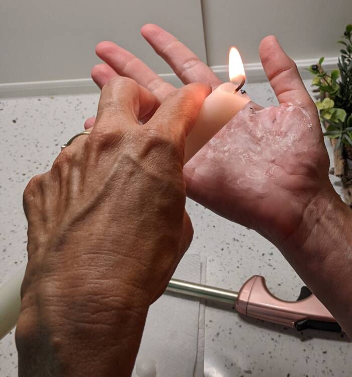 Julie found a unique use for one of our wedding candles. (Yes, we kept them all these years, and yes, Julie packed them into the camper thinking that we could burn them during a romantic dinner sometime.) Anyway, she had grabbed a broken-off fiberglass campsite marker and didn't realize what she was doing until there were lots of tiny shards of fiberglass embedded in her hand. So, she coated her hand in wax and then peeled it off in attempt to remove them. It was kind of successful, but at any rate, who doesn't enjoy peeling wax off of their hands? 😉