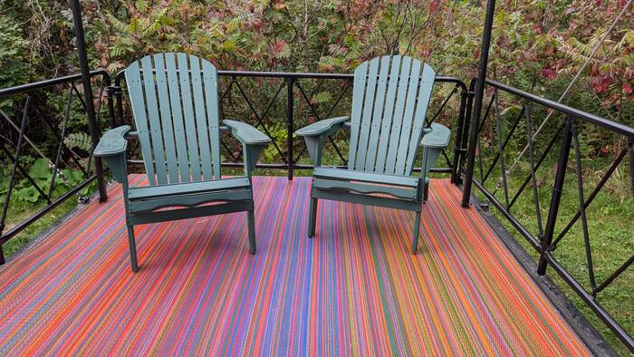Our previous deck rug was quickly disintegrating, so we had a new one delivered to the kids' house. Julie is not quite sure she loves the bright new look.