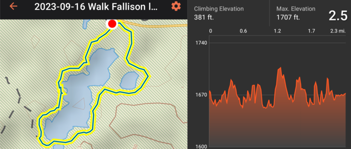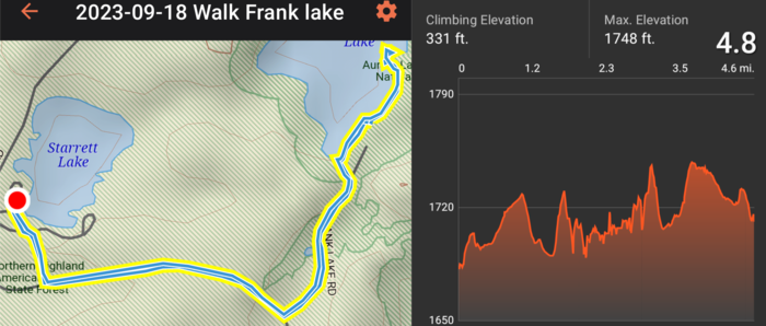 The day after that, Julie dragged Rick and his sore back out for a walk to nearby Frank Lake (a nice easy 4.8 miles). After being cloudy and gloomy in the morning, the sun started to come out, and it turned into a pleasant afternoon (although a little on the cool side--low 60s).