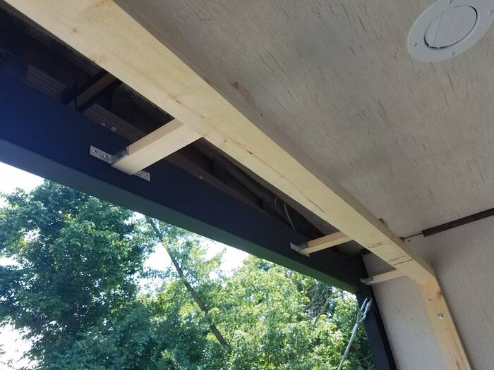 We also finished framing in the outline of the wall for the french door. We ended up cutting the 2x4's down to 2x3's (really 1.5x2.5) and using that so we would save weight and depth. We also anchored the new wall to the metal frame of the door with wood, angle irons, and pop rivets (thanks Deda for the ancient pop-rivet tool).