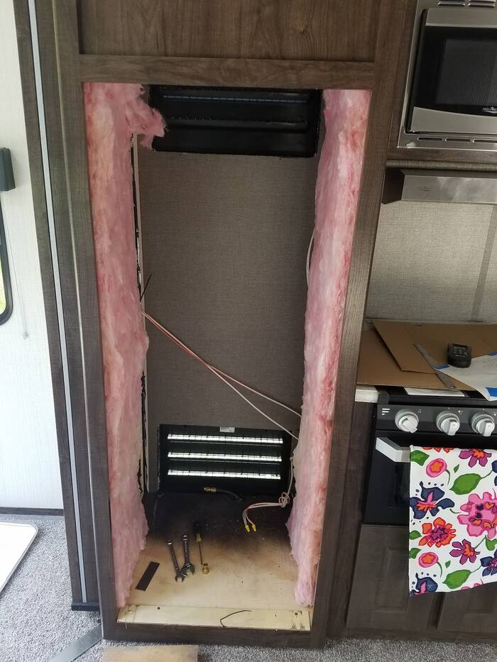 The refrigerator has sold, so we are ready to get and install the new refrigerator (which should be in next week). Also installed some screens on the vents in the back of the refrigerator opening.