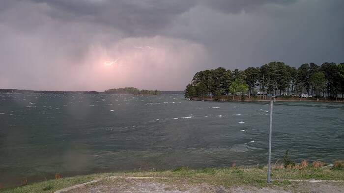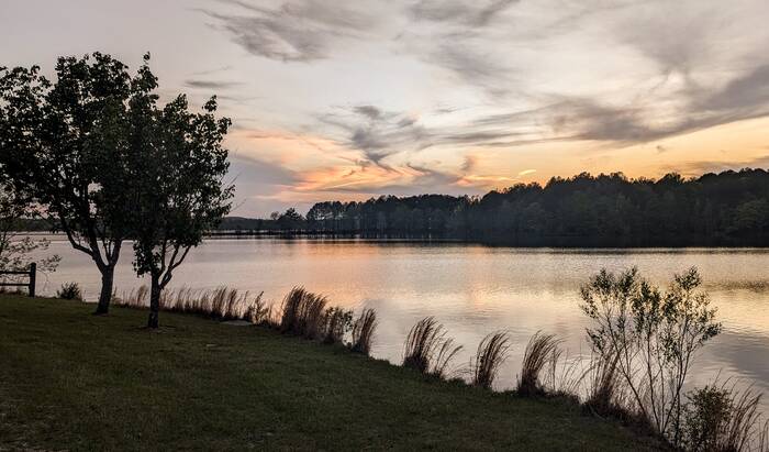 We drove through pretty countryside that would have been photogenic but for the copious amount of rain. Fortunately, the rain stopped before we got to our campground on Lake Sidney Lanier, and we were very grateful for that.