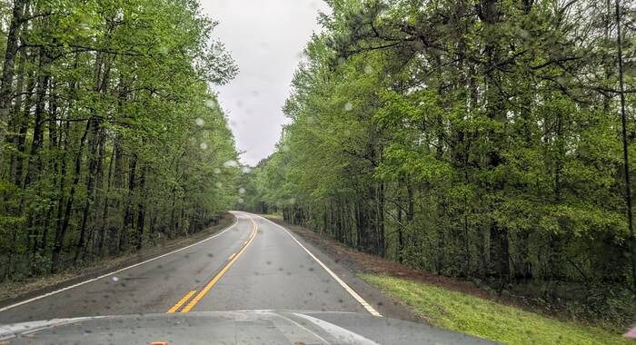 The forecast did not look promising for our Monday travel day. Rain was predicted for most of the day, and it had rained most of the night before. However, we lucked out in the morning and managed to take down and do our business at the dump station in between rain spells. Shortly after leaving the campground, the deluge started up again.