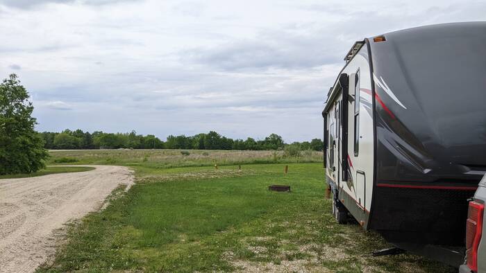 Campground Notes: We were the only ones here midweek, and we set up in the big gravel area just before the individual sites. It was rainy and cool, so we didn’t go out and explore, but there was a pleasant view of the rolling countryside from our camper.