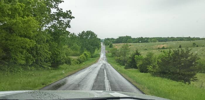 Roller-coaster hills of northeastern Missouri. (Excuse the dirty windshield!)