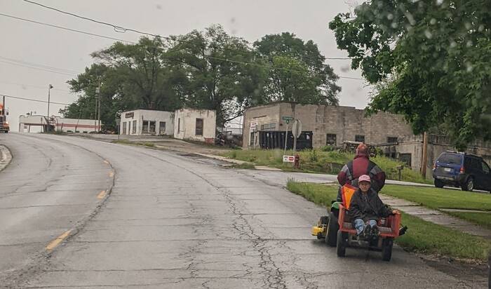 Local flavor "Exhibit A". Yes, that is a lawnmower he is driving on the street.
