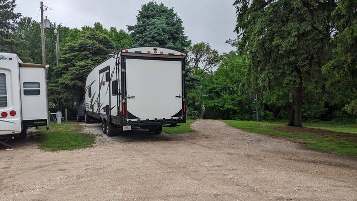 Campground Notes: We got one of the end sites, so we didn't need to disconnect. We walked to the nearby laundromat which was clean and serviceable. Dinner time seems to be a good time to go. There is electric and water at the sites as well as a dump station. Adjacent to our site was a walking trail, but the weather was not agreeable so we didn't check it out. There were about 5 other campers here on a Wednesday night in mid-May. Looks like it would fill up easily in the summer. Our stay was quiet and uneventful.