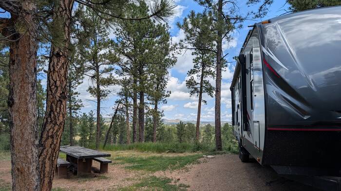 Our first night was just an overnighter in the Custer Gallatin National Forest. We never know exactly what to expect with first-come-first-serve boondocking sites. Will there be any sites left? How hard are the sites to access? Internet research helps, but there are still unknowns, and there is always a slight amount of trepidation as we approach a place like this. Well, in this case we didn't need to worry. We were the first ones to arrive at the free campground, and we were able to choose the most scenic spot (which also happened to be quite easy to get into).