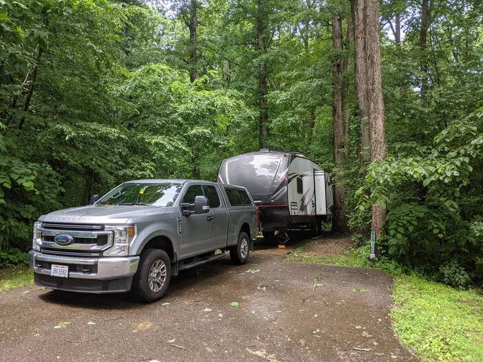 We tow the camper with a 2021 Ford F-250 XLT truck.