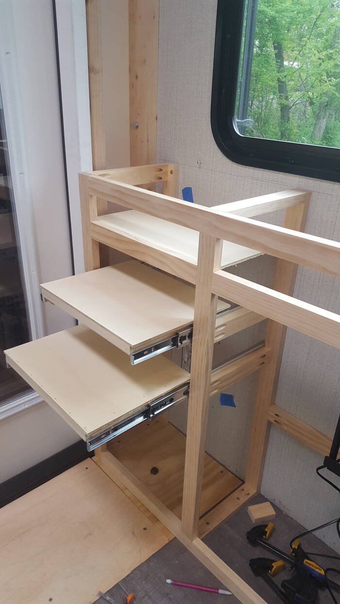 Not shown in here is the TV mounted on the lift with the speaker mounted directly above the TV (going up and down with it) and sub-woofer will be located under the TV.