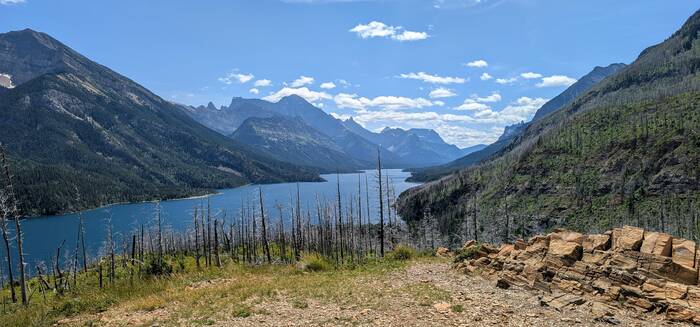 It cleared up on Friday, and we took the Bertha Lake trail right off of the campground. We opted not to go all the way to Bertha Lake for a few reasons: we were kind of tired of the burned/dead tree look; Rick's allergies have been sapping some of his energy and it would have been quite the additional climb; it didn't seem like we could top the views of Upper Waterton Lake that we had along the first half of the hike; and some hikers warned of a large bear near the trail if we kept going. So, after we made it to the official overlook point, we decided to turn back.