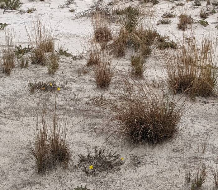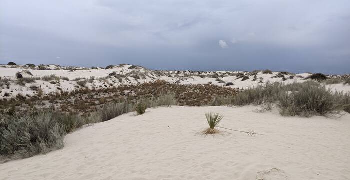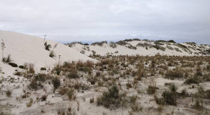 Our first glimpse of the white sand dunes along the scenic drive. It had been drizzling, which made it look like it just snowed and the road was plowed.