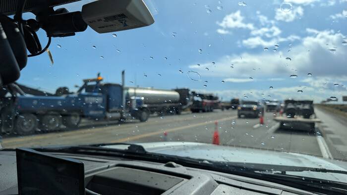 We were delayed about 20 minutes while a tanker with a burnt engine and cab was cleared from the middle of the road. Unfortunately, it had just started to rain, and the camera focused on the raindrops instead of the more interesting carnage.