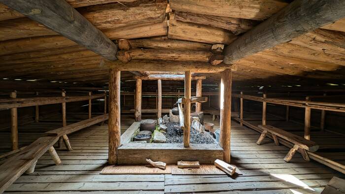 A barracks building of the late 1800s, housing up to 60 men who worked during the winter months felling trees and cutting them into logs for transport during the spring thaw