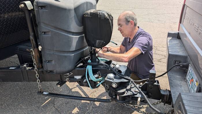 After concluding that this particular component wasn't strictly necessary to keeping the trailer attached to the truck, we departed with the plan to deal with this at our next location. (FYI: This component keeps the trailer from swaying. Without it, the trailer can meander side to side uncomfortably, and the tongue of the trailer can shift left and right a couple of inches during braking--also a little unsettling.)