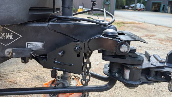 Some rust was appearing on our newly-welded hitch piece, so Rick took some time to spray paint it. The welder didn't have time to do this, as he still works a full time job and does welding as a side business, not to mention the fact that we required a rush job. During the painting process, Rick inspected the repaired piece more closely. It looked quite good with nice clean welds, several new reinforcement plates, and most importantly--no new cracks!