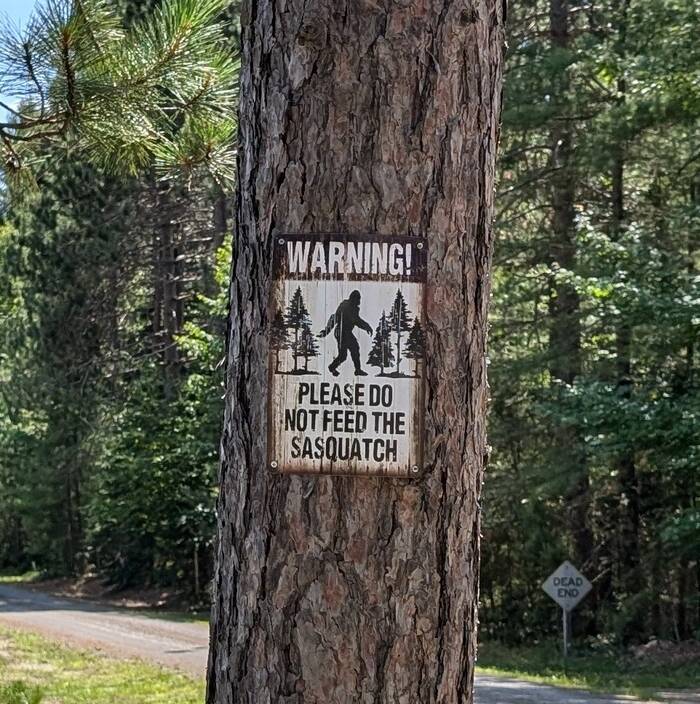 If you can't read the sign, it says "CAUTION: BIGFOOT SIGHTINGS IN THE AREA"