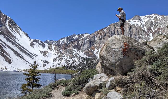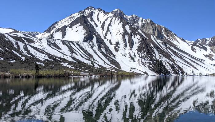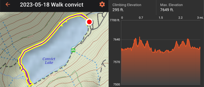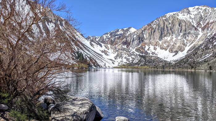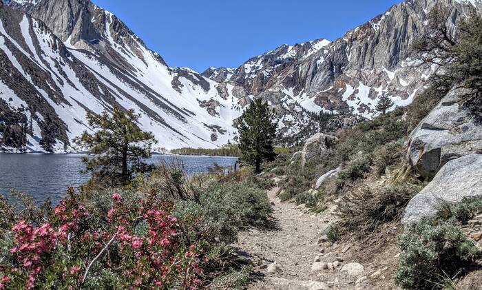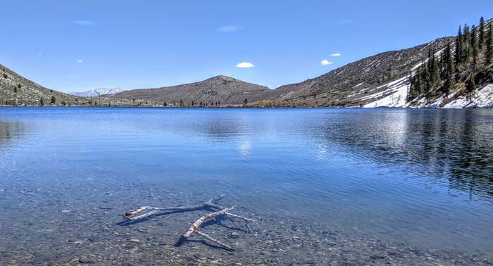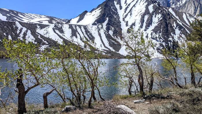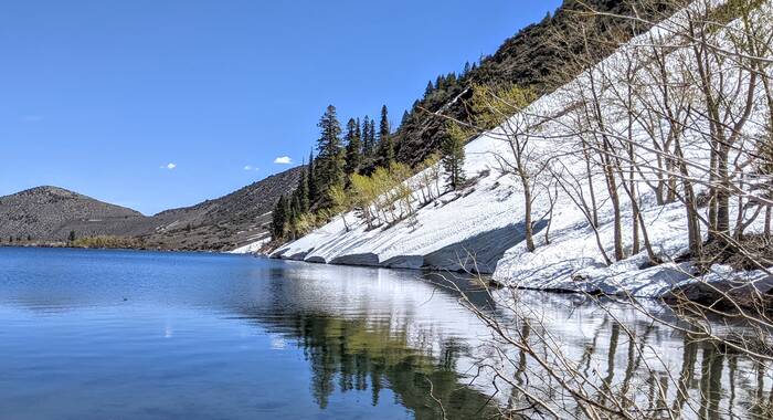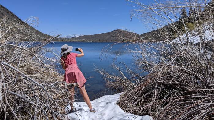 Thursday, we headed north along 395 and to higher elevations. Our first stop was Convict Lake. Most of the trail circling the lake was clear of snow, except for a spot a little more than halfway around the lake.