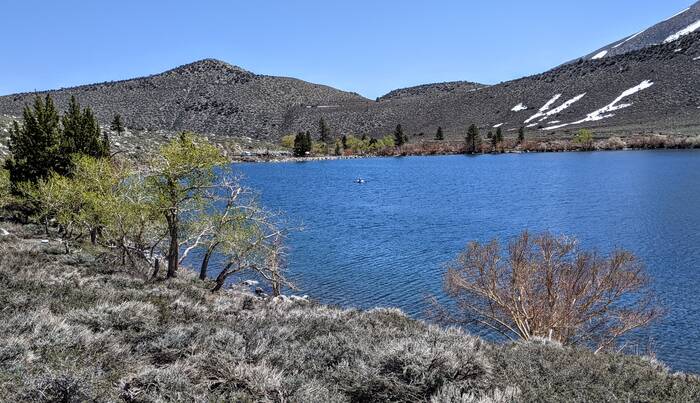 The lake had a split personality. The north and west ends had an alpine appearance, whereas the south and east ends were scrubby desert-like. The picture-taking was clearly biased toward the alpine views.Â