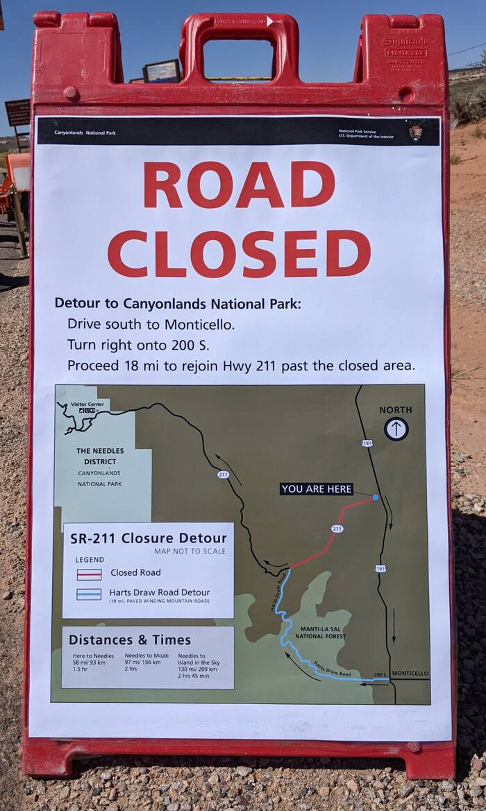Our journey to Canyonlands was going smoothly until we turned off highway 191 onto Utah 211 which is the only way into Canyonlands (so we thought) . . .