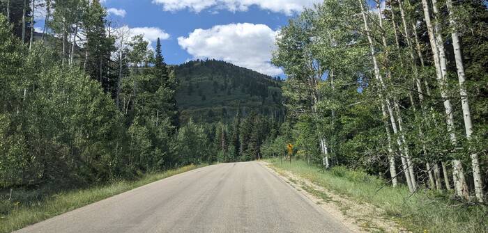 Oh great--a detour through a narrow winding mountain road! Well this was going to be interesting. At least the detour road promised to be paved, but it meant that we were going to have to go up through the mountains and then back down again. Oh well, not much choice here. So, we filled up the gas tank in Monticello and headed off into the mountains. Turns out, the road was plenty wide, and it was a surprisingly nice drive. As an added benefit, it was 20 degree cooler (it was getting into the 90s by now). The road wound through national forest land and eventually brought us back to Utah 211 so we could continue to our camp.